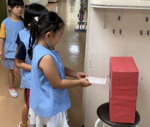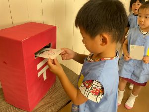 敬老の日には、おじいちゃまやおばあちゃまに葉書を送ります。幼稚園の特設したポストに入れて、あとで先生が郵便局のポストに投函します。