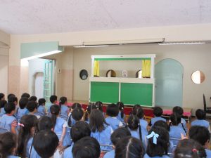 9月生まれのお友たちをお祝いする誕生会では、先生たちが「おむすびころりん」を見せてくださいました。