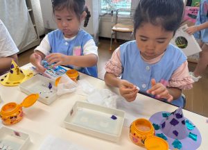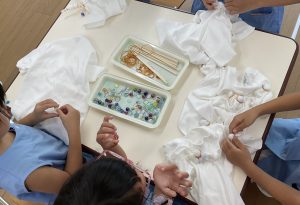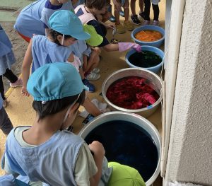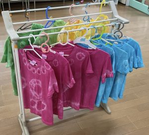 年長さんは運動会に向けて… 組み立て体操の時に着るTシャツを、絞り染めしました。思い思いに輪ゴムでくくり、好きな色に染めあがりました。