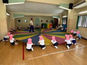 年中さんの運動会に向けての練習と準備の様子です。(1枚目)バルーンの練習を体操の先生のご指導のもと、お遊戯室でおこなっています。 (2枚目)子どもたちは、ダンスでかぶる自分用の帽子を制作しています。